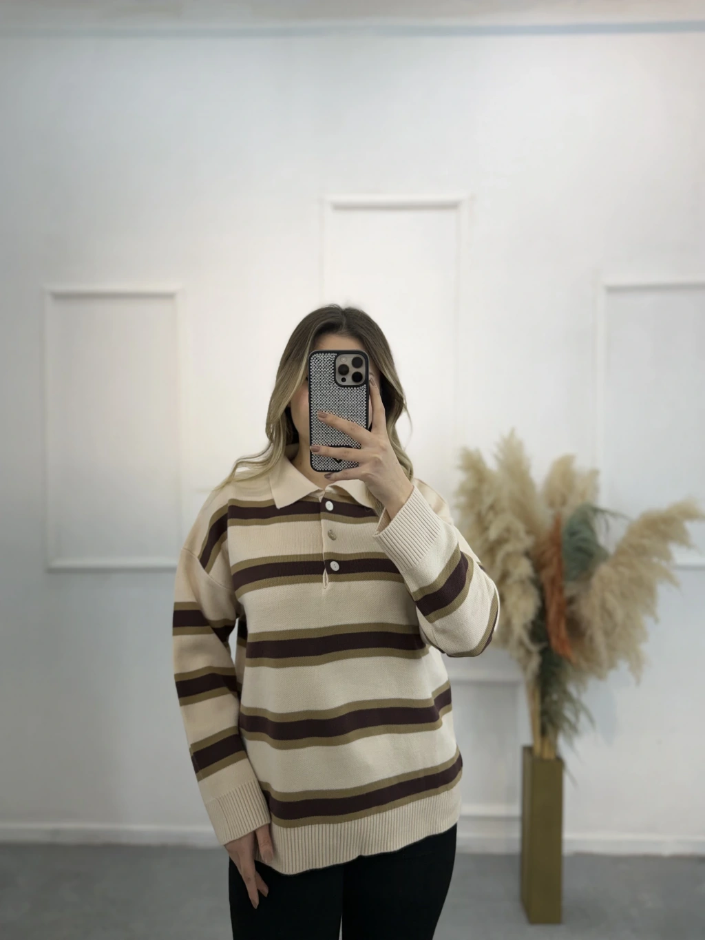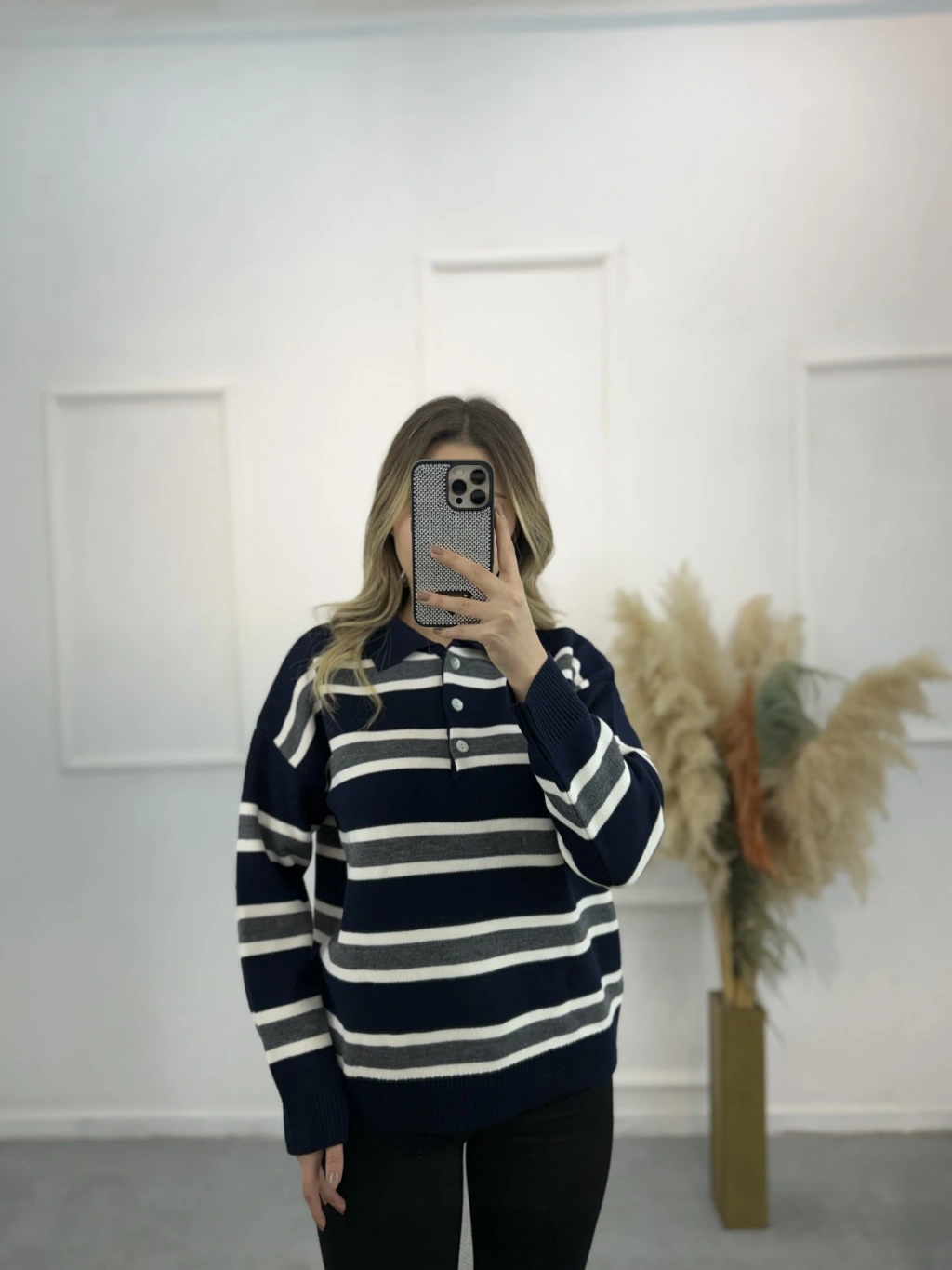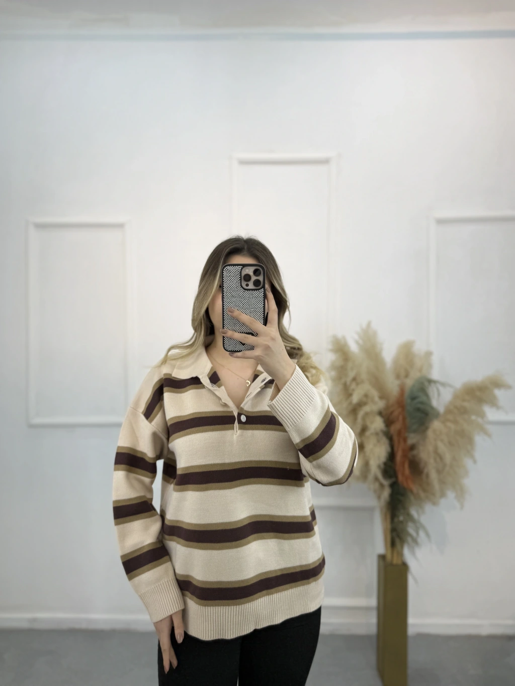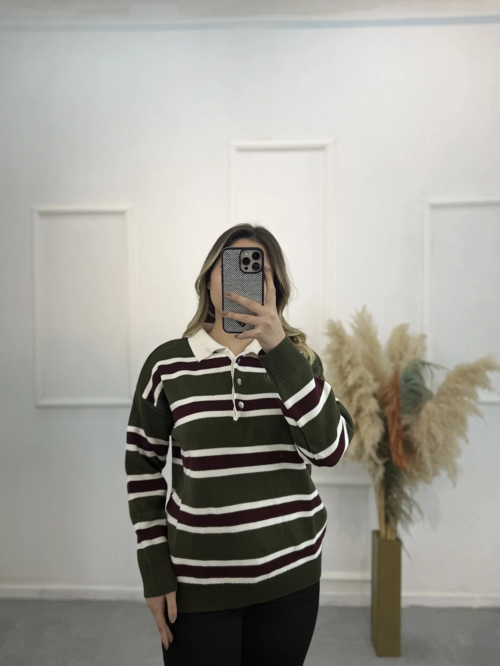Polo Yaka Çizgili Triko Kazak