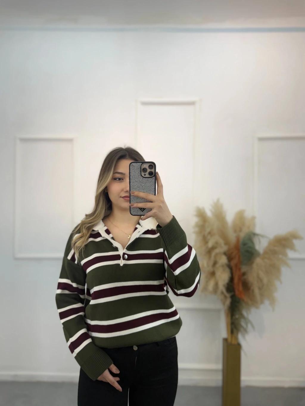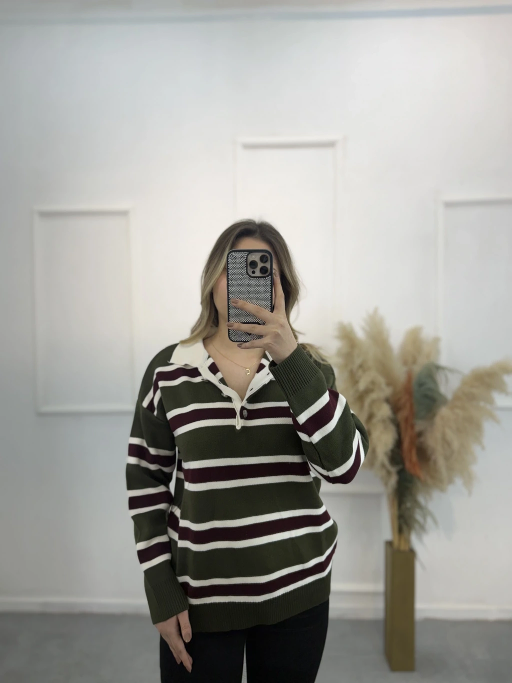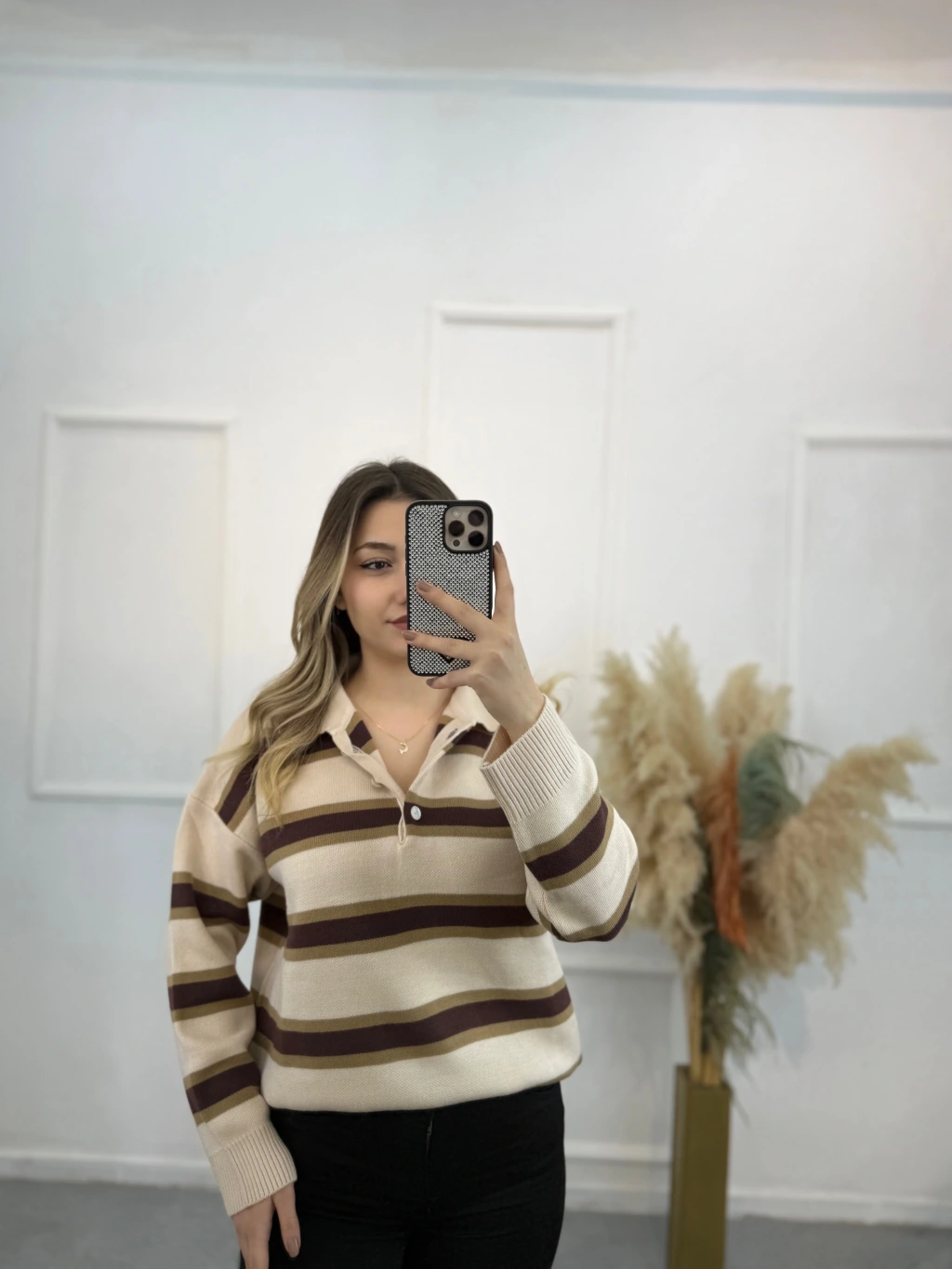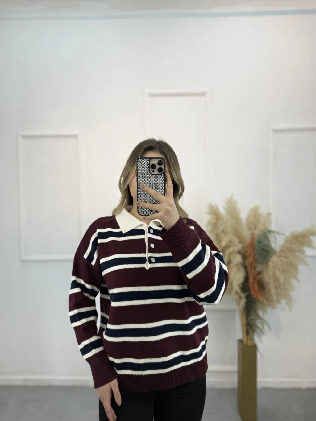 Polo Yaka Çizgili Triko Kazak