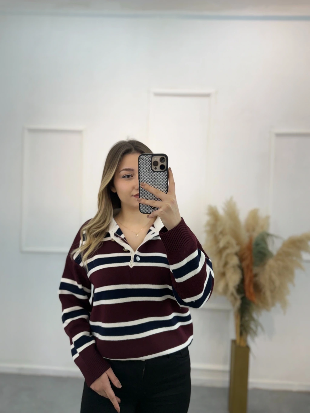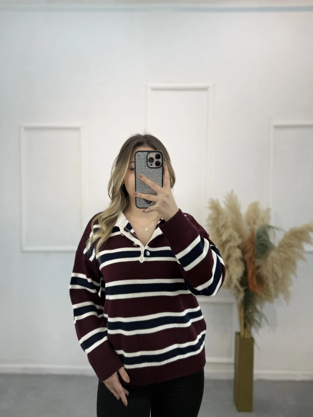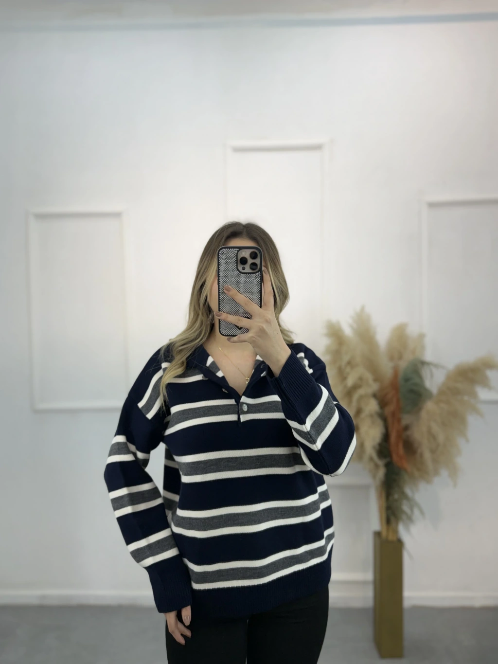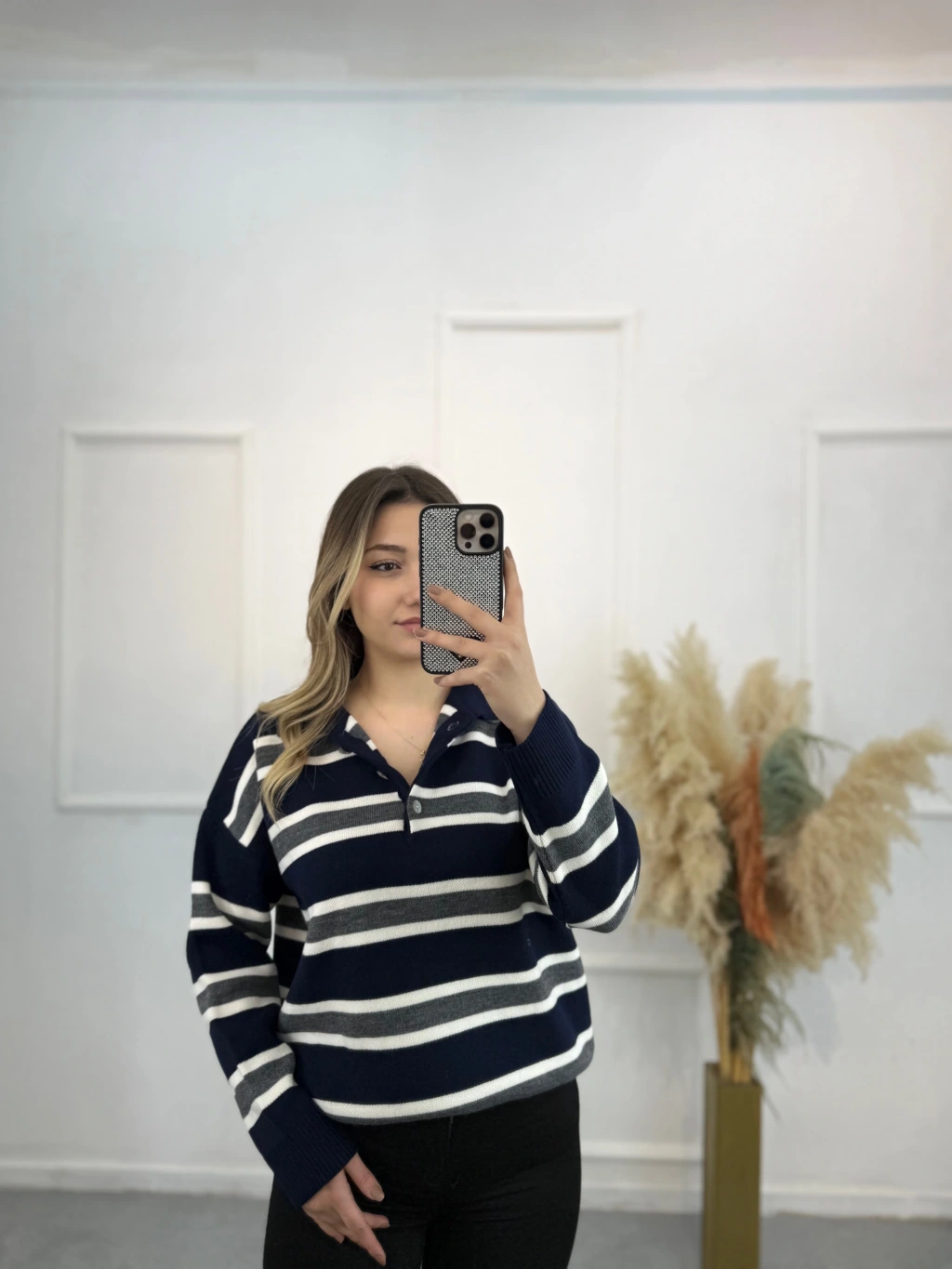 Polo Yaka Çizgili Triko Kazak