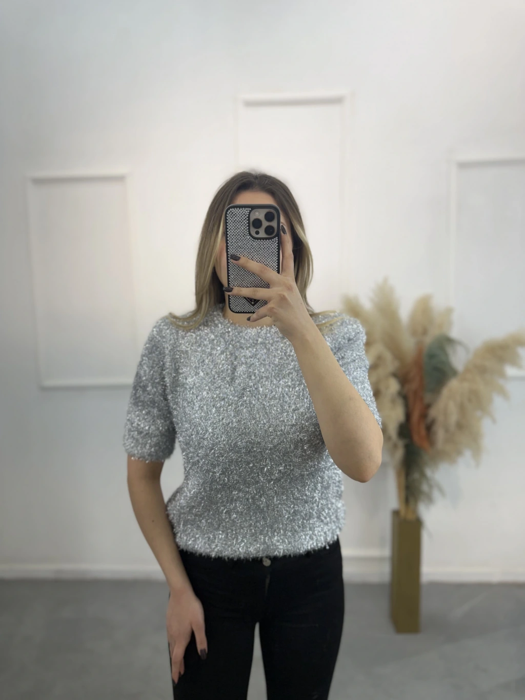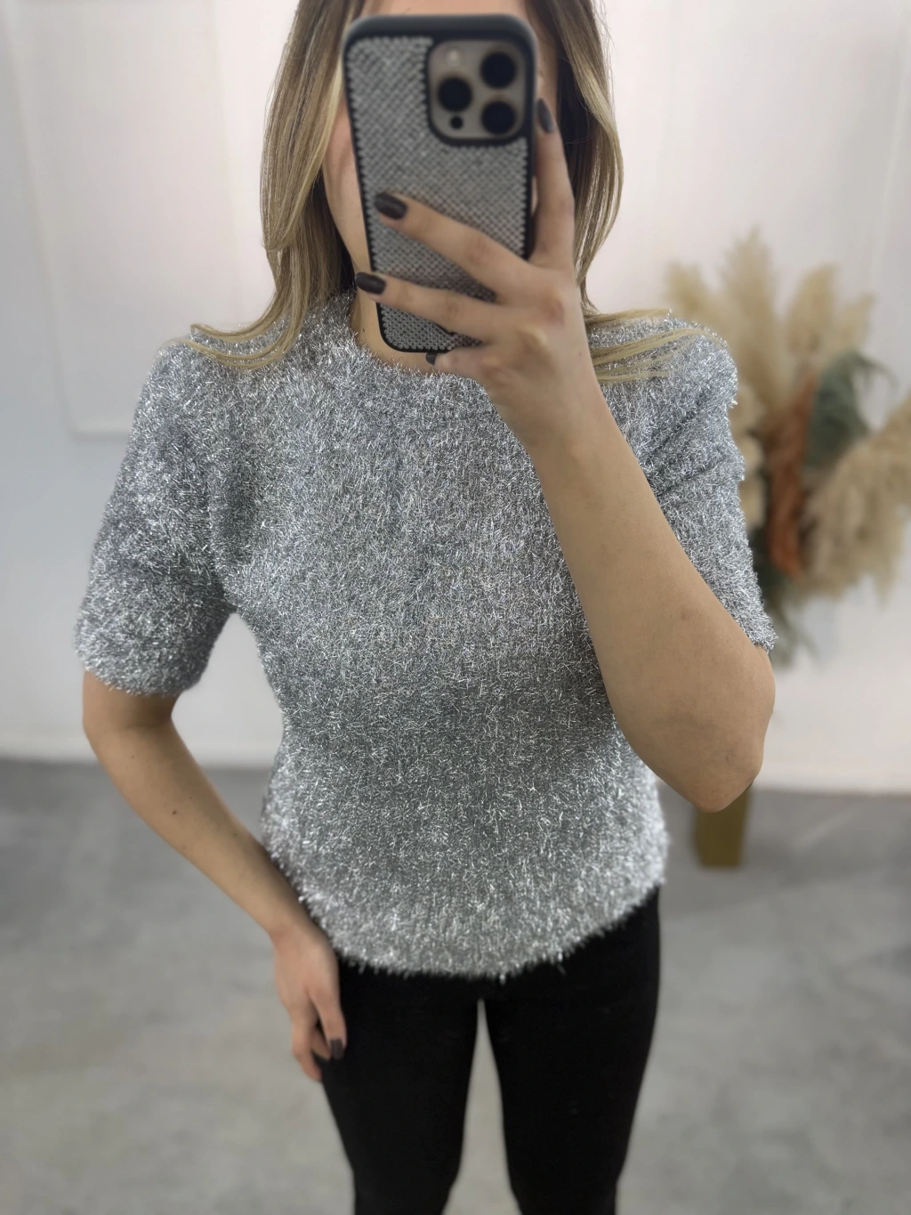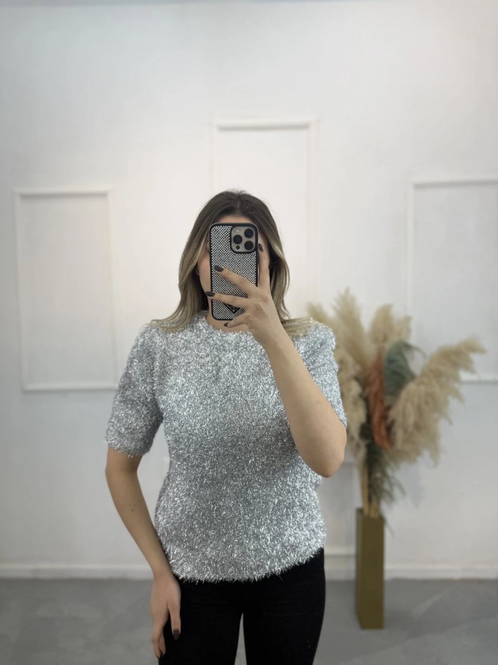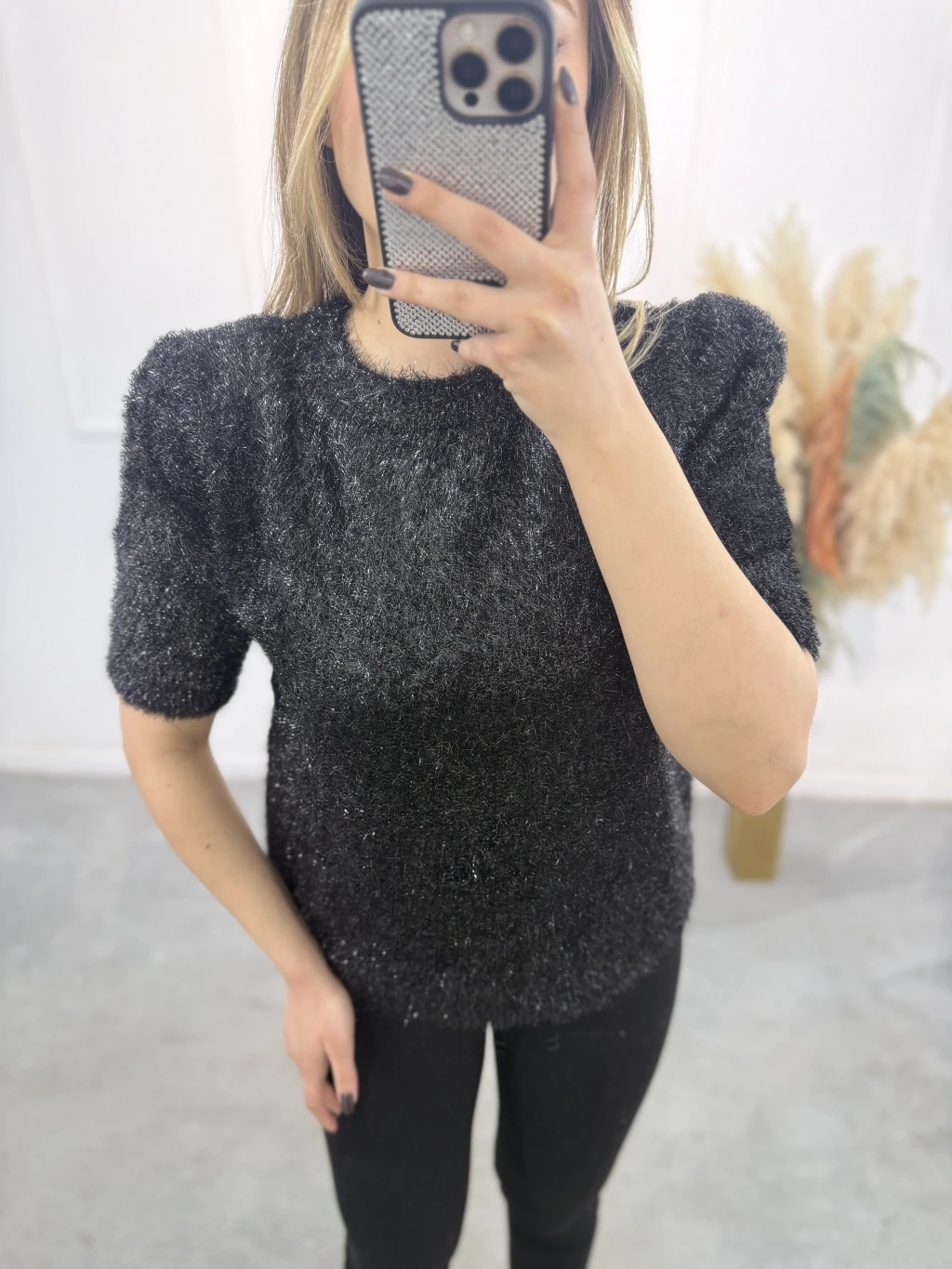 Simli Angora Kısa Kol Kazak
