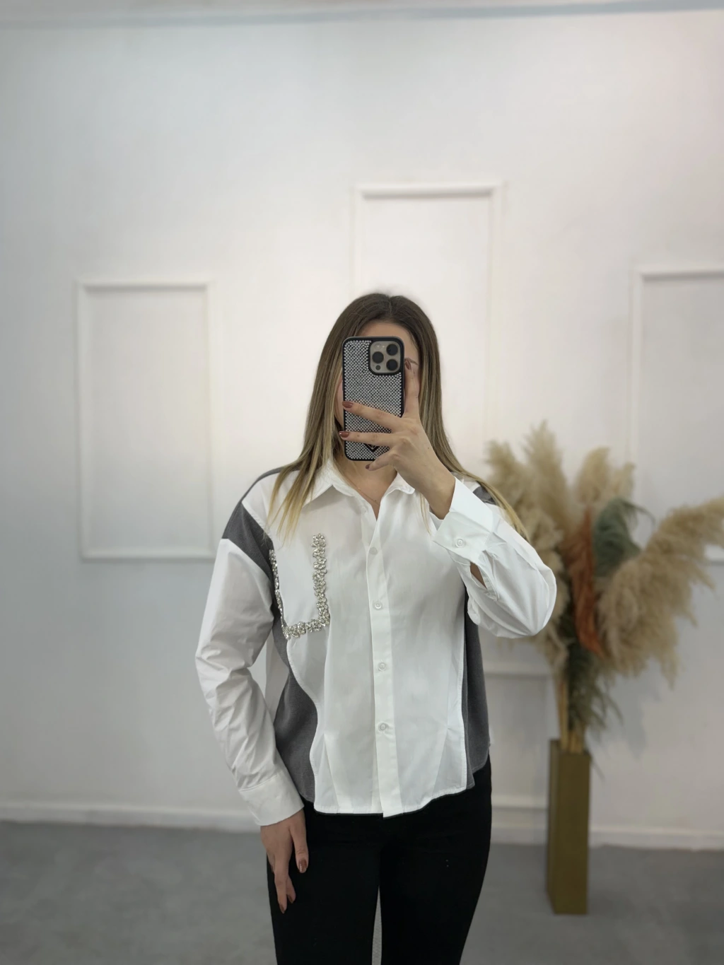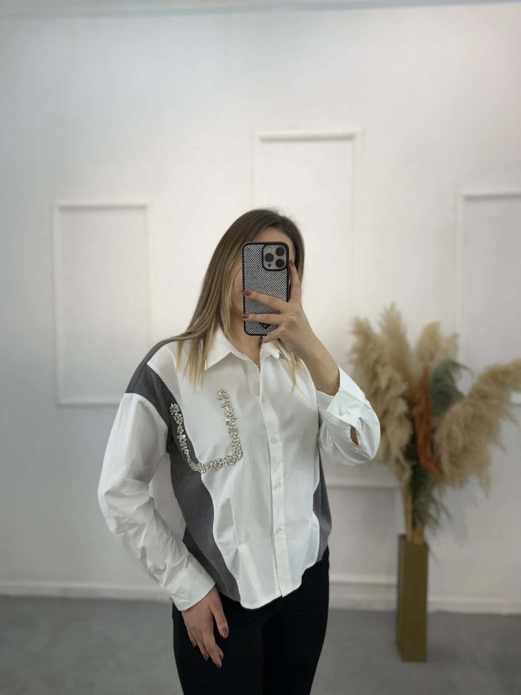 Triko Garnili Poplin Taşlı Gömlek