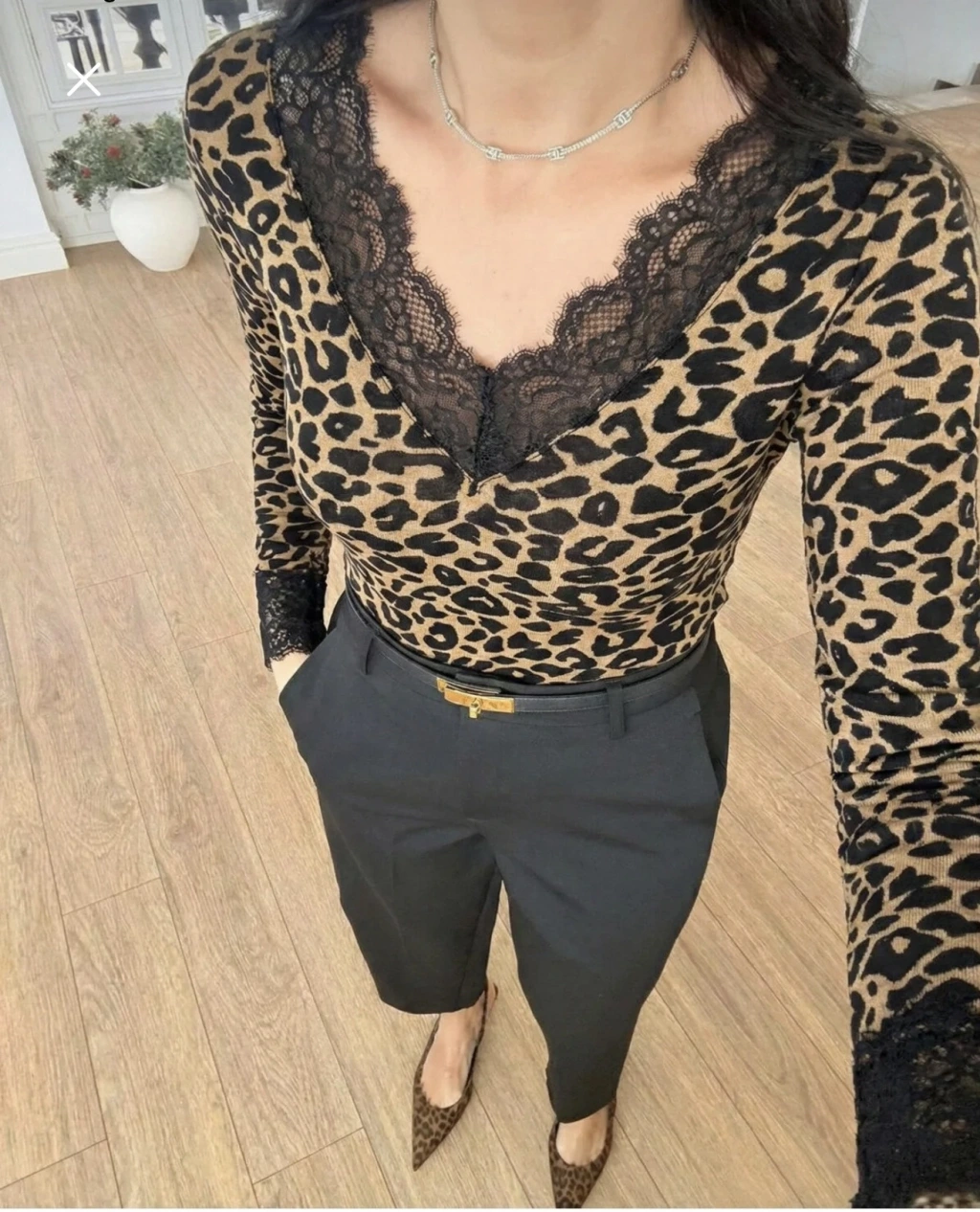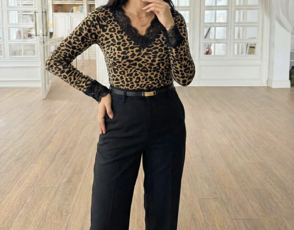 V Yaka Dantelli Leopar Bluz